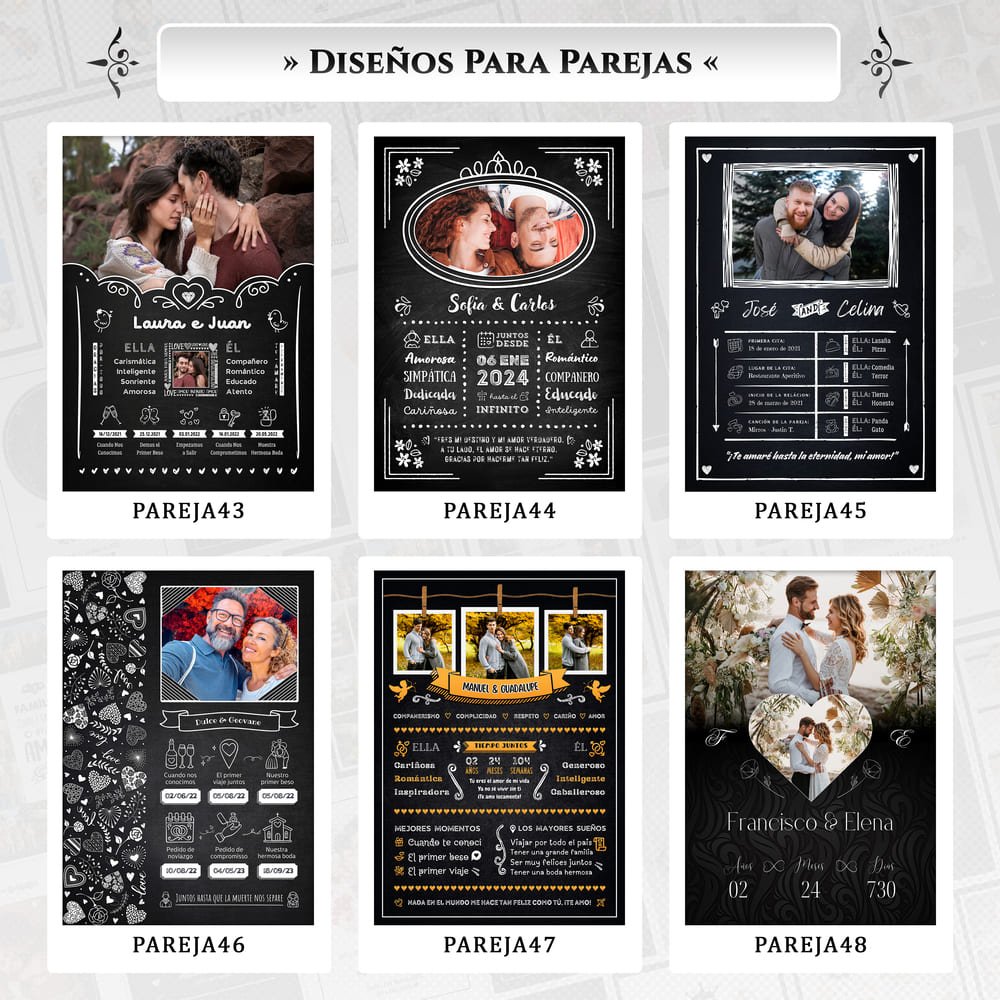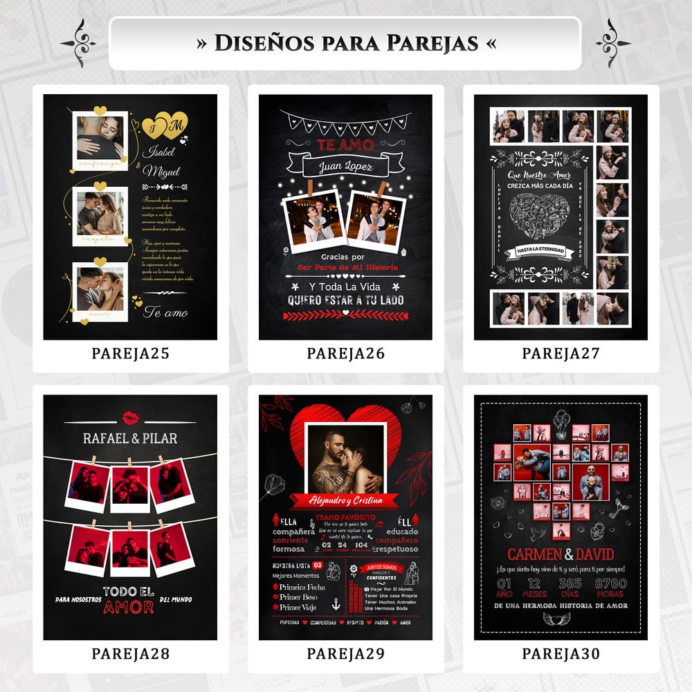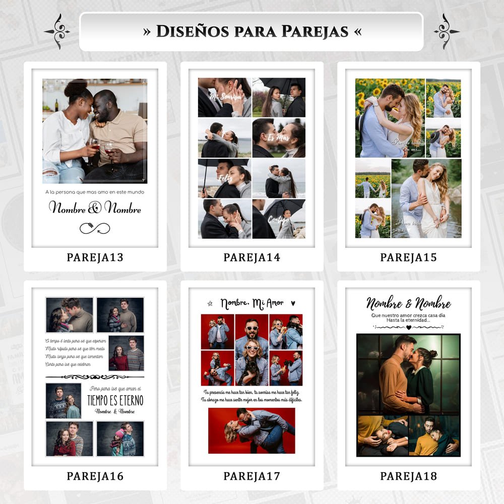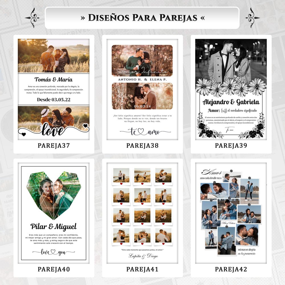 Elige diferentes opciones de diseño y personaliza con tus fotos, frases y nombres.