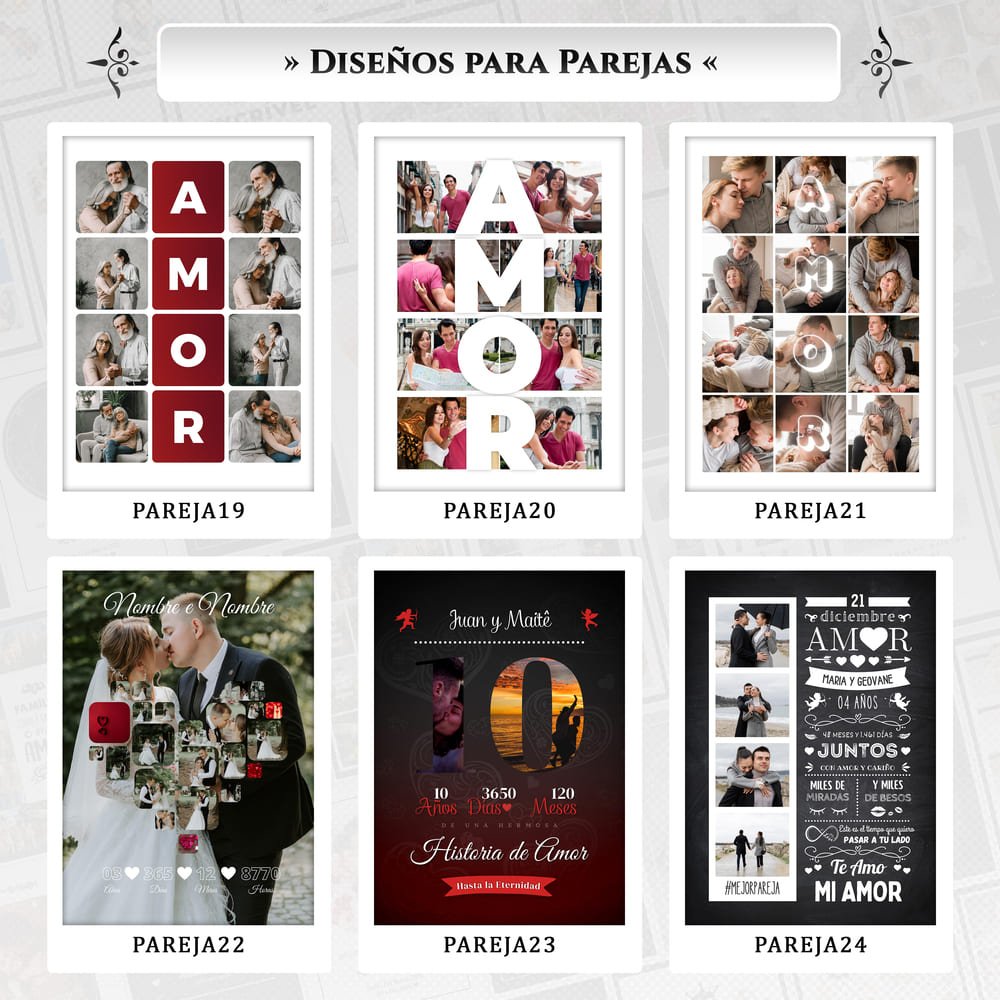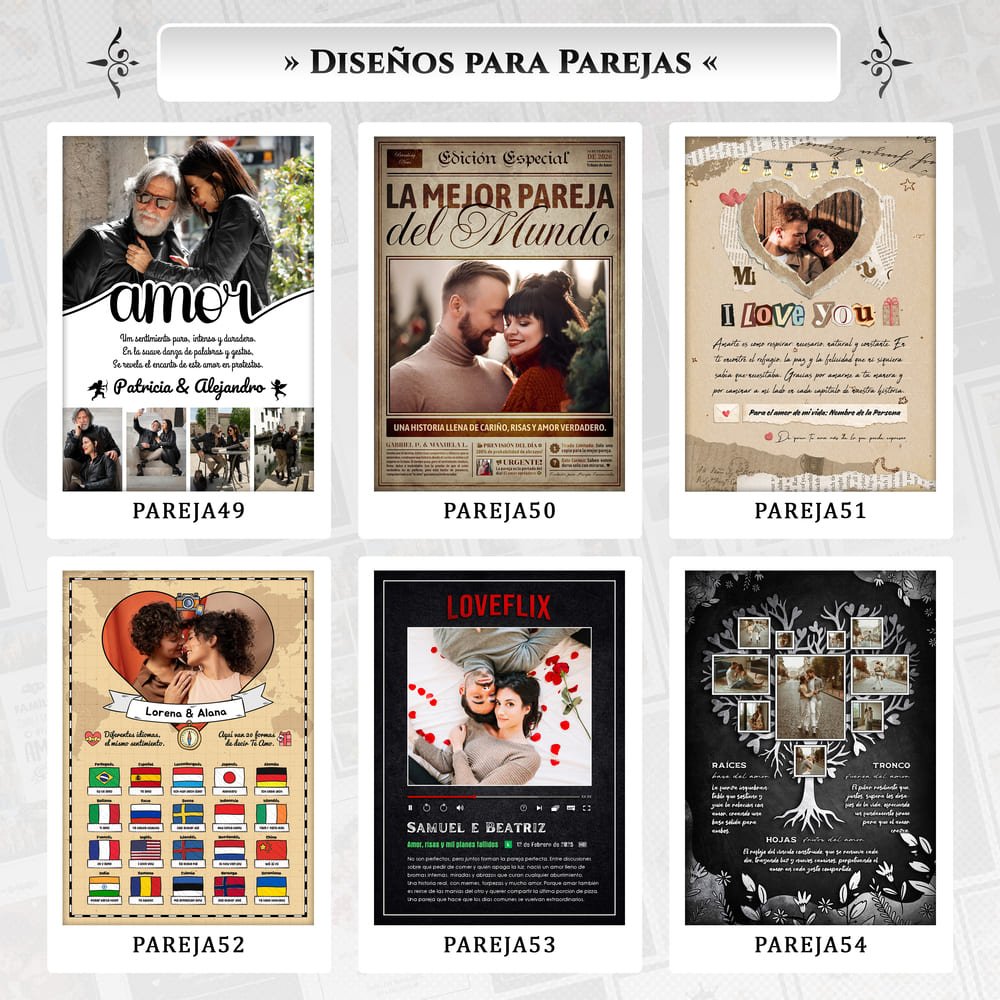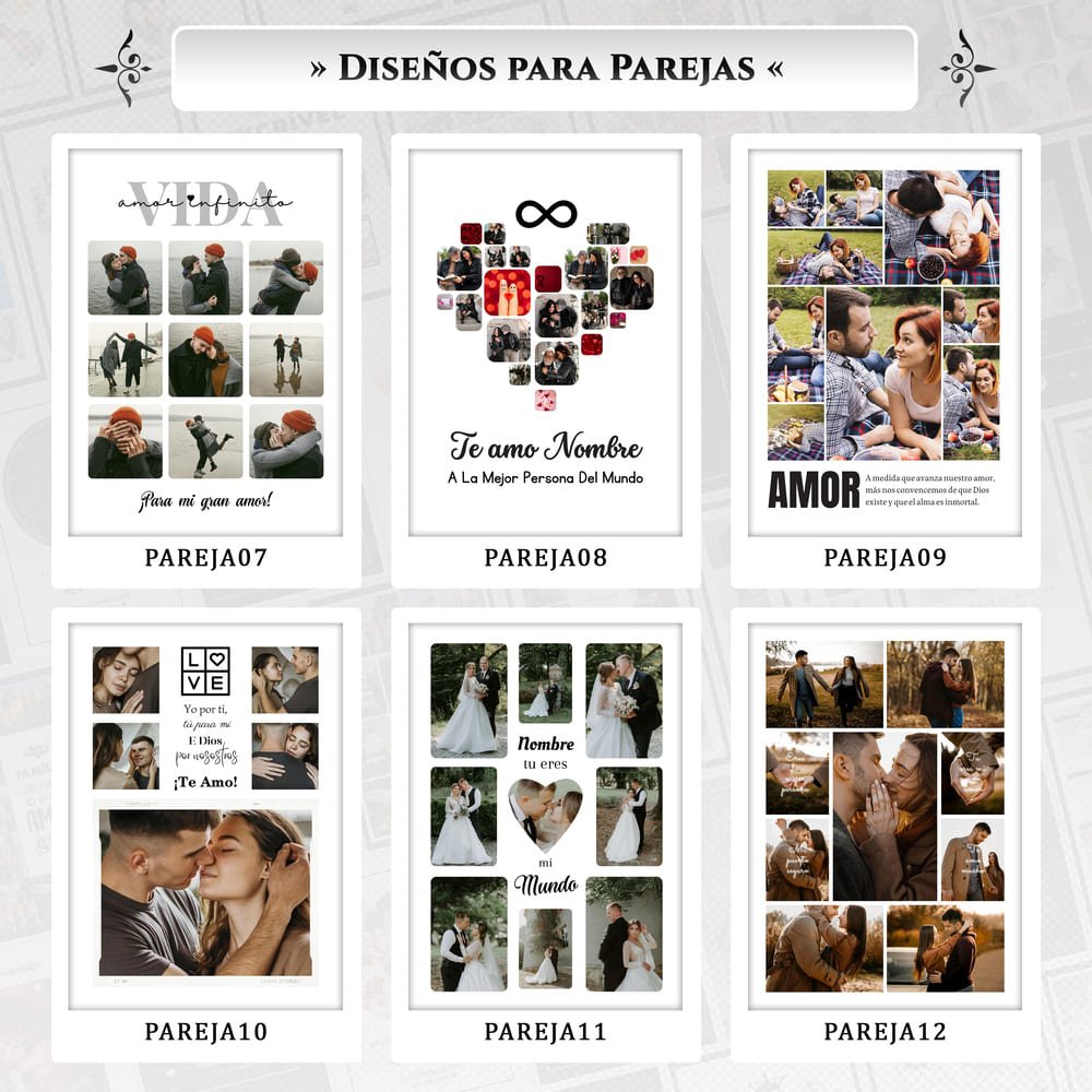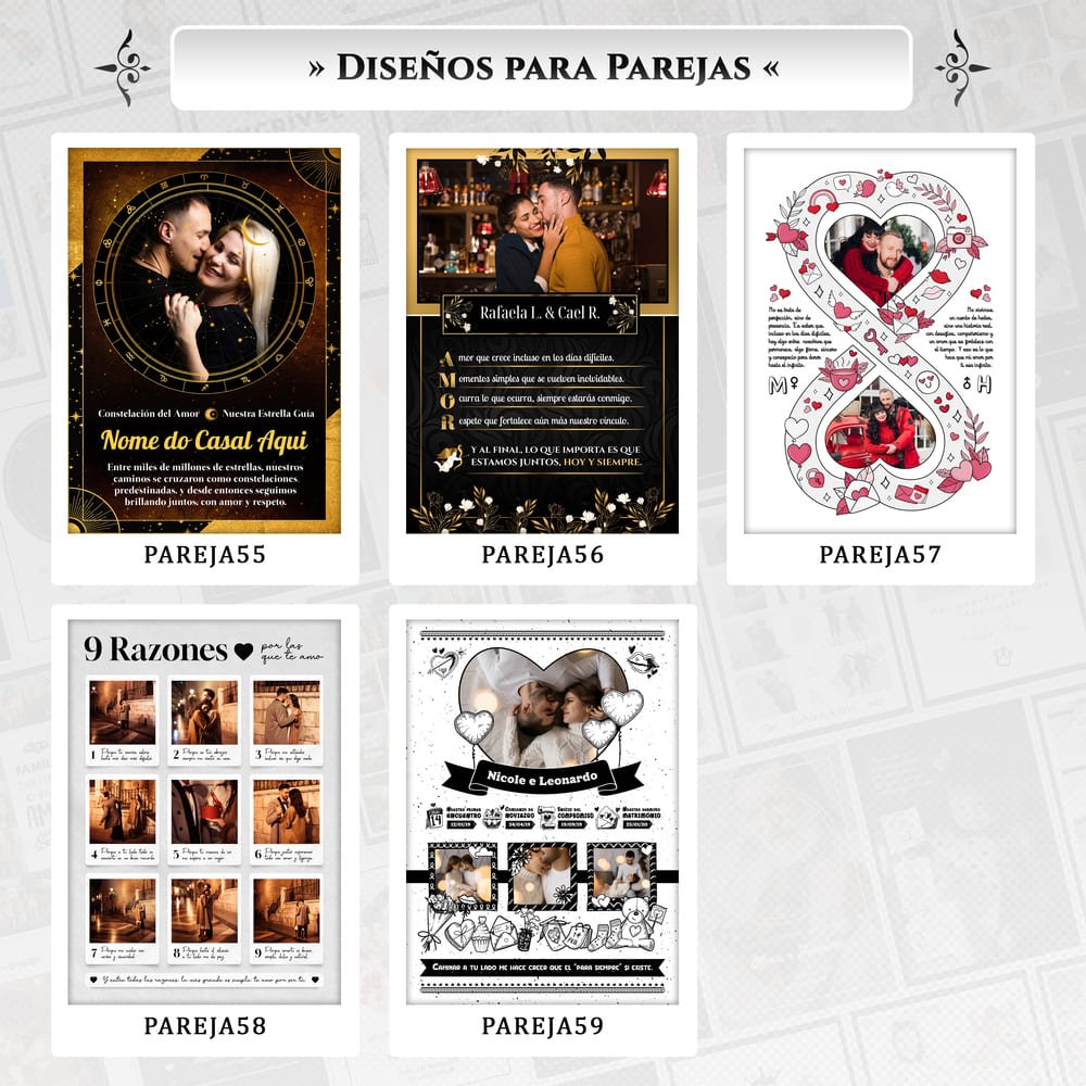 Elige diferentes opciones de diseño y personaliza con tus fotos, frases y nombres.